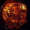 A pumpkin that has been carved to look like Jenny Park’s chibi Mollymauk Tealeaf. The lights are out in the room, the outside of the pumpkin is dark, the light from inside casts a warm orange glow through the varying layers of pumpkin flesh.