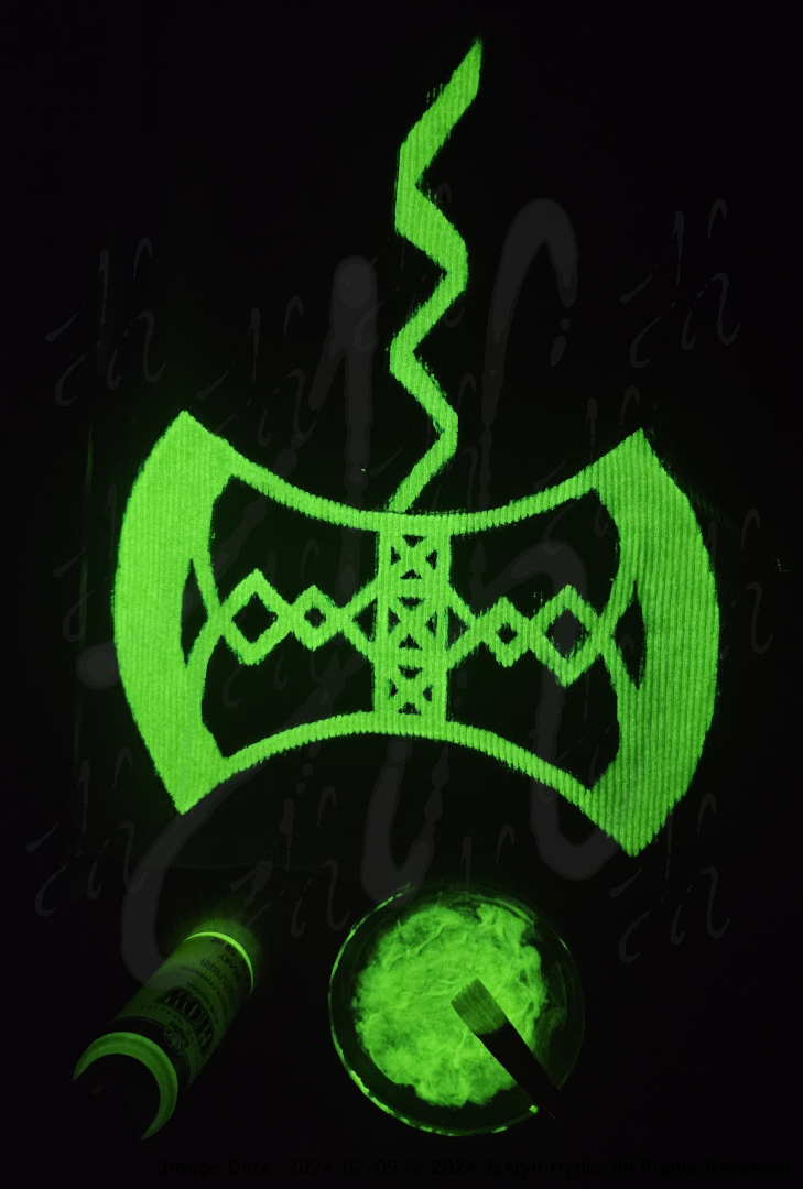 A custom labrys design by Jeklyn Hyde that has been painted in with glow-in-the-dark paint, and is fluorescing bright green in the darkness.
