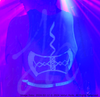 Jeklyn Hyde wearing the crop top with their custom labrys design painted glow-in-the-dark. They are at a rave and the room is washed out with the purple hues of blacklights. The labrys is fluorescing brightly in the darkness.