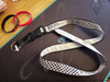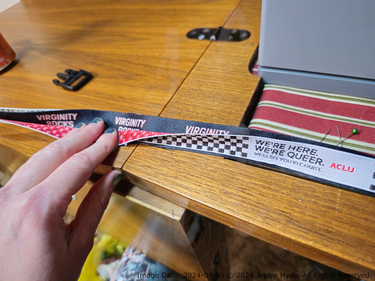 White lanyard with “We’re here. We’re Queer. We’ll see you in court” and checkerboard pattern in black stitching, and ACLU in red. This has been stitched along one edge to the “Virginity Rocks” band. The back side of the ACLU band is folded over and you can see a lot of red threads.