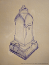 The corners of the tall edges are beveled and terminate at the top with what appears to the likeness of a tassel. From here the corners arc upward toward each other and peak in the middle of the faces of the stone on all sides. A short cube meets these peaks at the top at a 45-degree angle to the faces of the stone. The top of the stone has a rounded and contoured piece that appears to have partially broken off.