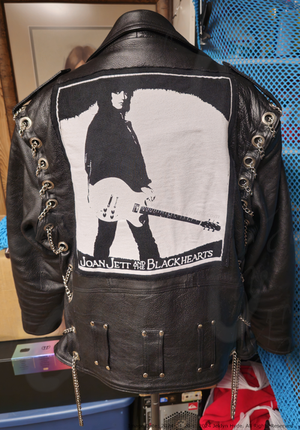 The back of a black leather jacket that has the arms attached again resting on a mannequin. A Joan Jett graphic is sewn on. The leather dye has been recently refreshed, and with a second coat of acrylic sealant, it is looking vibrant and shiny.