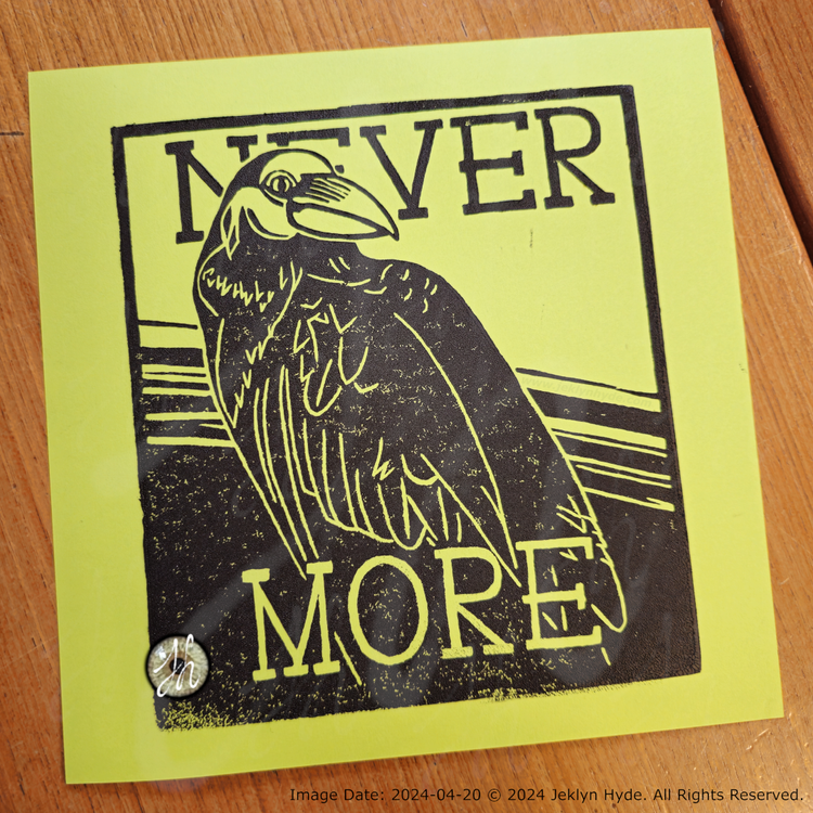 The final print made during this session of the Never More Raven on a square piece of lime green paper. The ink almost has full coverage of the relief areas, but still has some empty spots to bring a little more variety and visual texture to the piece.