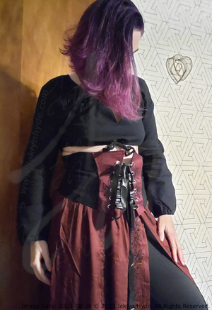 Jeklyn Hyde wearing a black crop top, a black and burgundy lace corset, and a long burgundy skirt over black leggings. She is looking down and her purple-pink hair obscures her face.