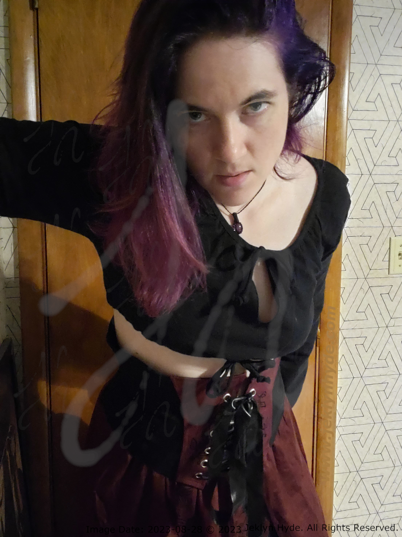 Jeklyn Hyde wearing a black crop top, a black and burgundy lace corset, and a long burgundy skirt. She stares into the camera with a look that says: "I'm going to eat you."