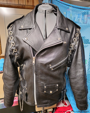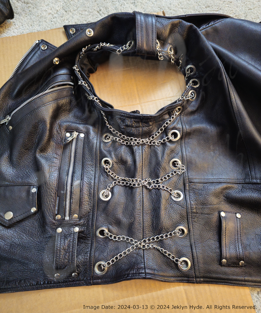 When I bought this jacket it had some super long hanging chains. They run through eyelets at the sides and around the shoulders. There's a lot of extra chain to allow the sides to expand and contract and while fun, it would get in the way more often than not. So I contracted the jacket down just about as small as it gets and removed the extra chain.