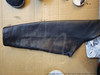 A leather sleeve that has been detached from the rest of the jacket via zipper. The lower half has been treated with black leather dye balm contrasting with the untreated top half.