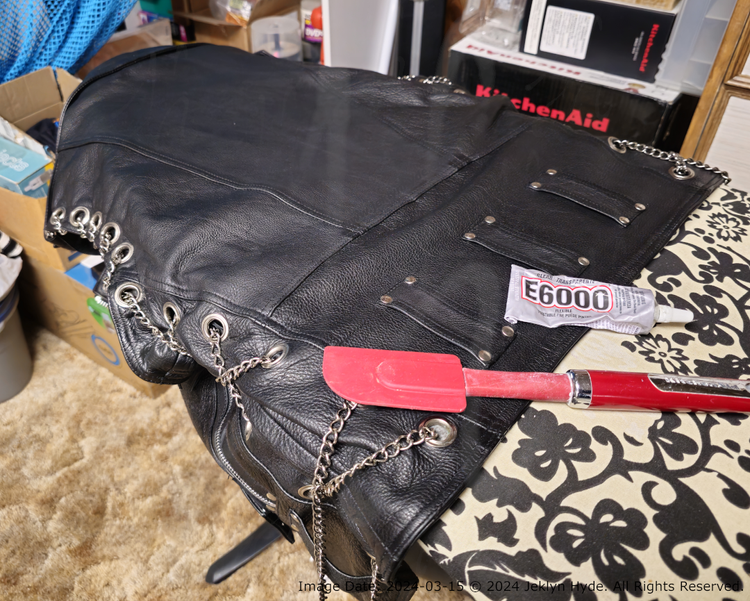 A leather jacket hanging over the pointed end of an ironing board. A red spatula and a tube of E6000 glue rest on the jacket.