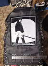 A white-on-black Joan Jett graphic that has been sewn to the back of a black leather jacket.