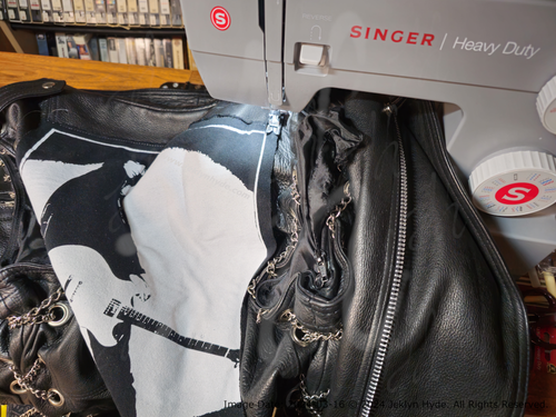 I bought a Joan Jett zip-up hoodie at a concert a long while back (in the late aughts to early 2010's), and the zipper finally gave out last month. I decided, rather than trying to repair the hoodie (I have too many anyway), that I would cut out the graphic and sew it onto my leather jacket.