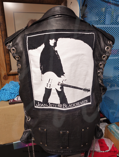 Black fabric that has been cut to frame the rectangular extents of a white graphic showing Joan Jett with an electric guitar slung low on her back with the headstock pointing at an angle toward the ground. Joan is looking back over her shoulder. At the bottom, the text “Joan Jett and the Blackhearts” in all caps. This is resting on top of the back of a black leather jacket with chains around the arm holes.