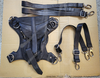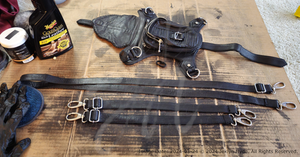 A black leather satchel with matching straps and silver-coloured metal attachment points and hardware, that are all resting splayed out on a piece of carboard that has a lot of dried black dye on it.