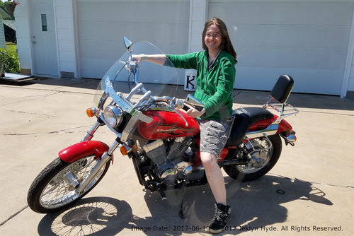 Jeklyn wearing a green hoodie and camo shorts, sits on a red and black cruiser-style motorcycle that is parked in a driveway in front of closed garage doors, her arms are outstretched holding the handlebars and she is smiling broadly as this is the day she bought her first motorcycle. It is a 2007 Honda Shadow Spirit 750 that has a bright red body with black flame decals, and a large windshield.