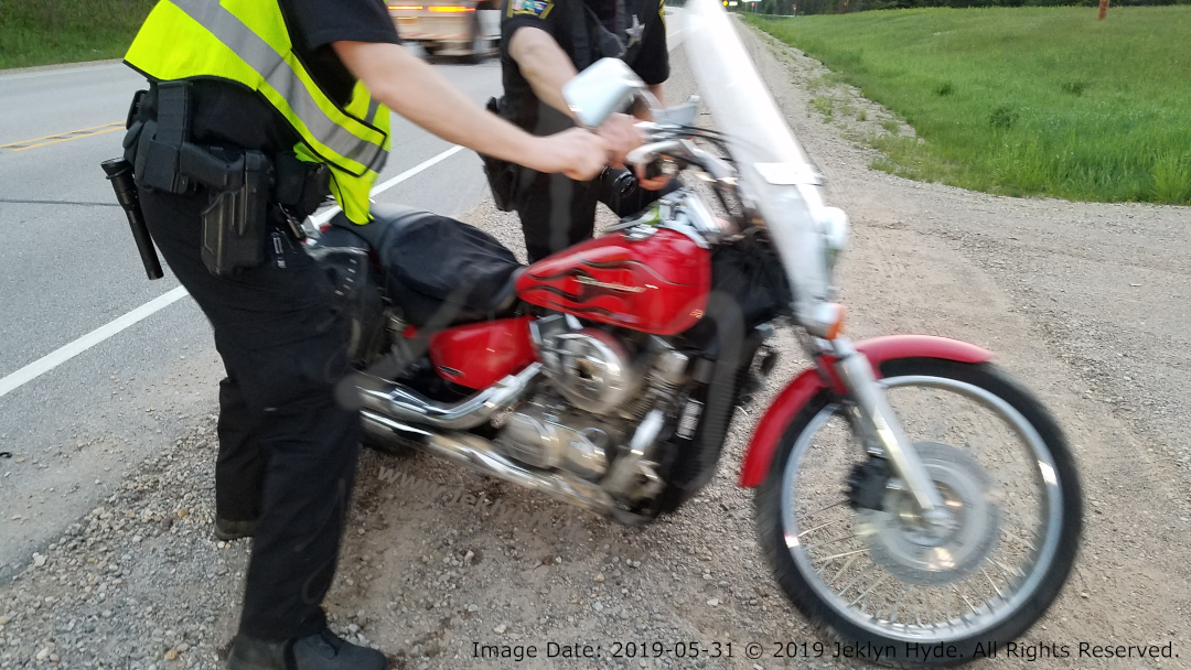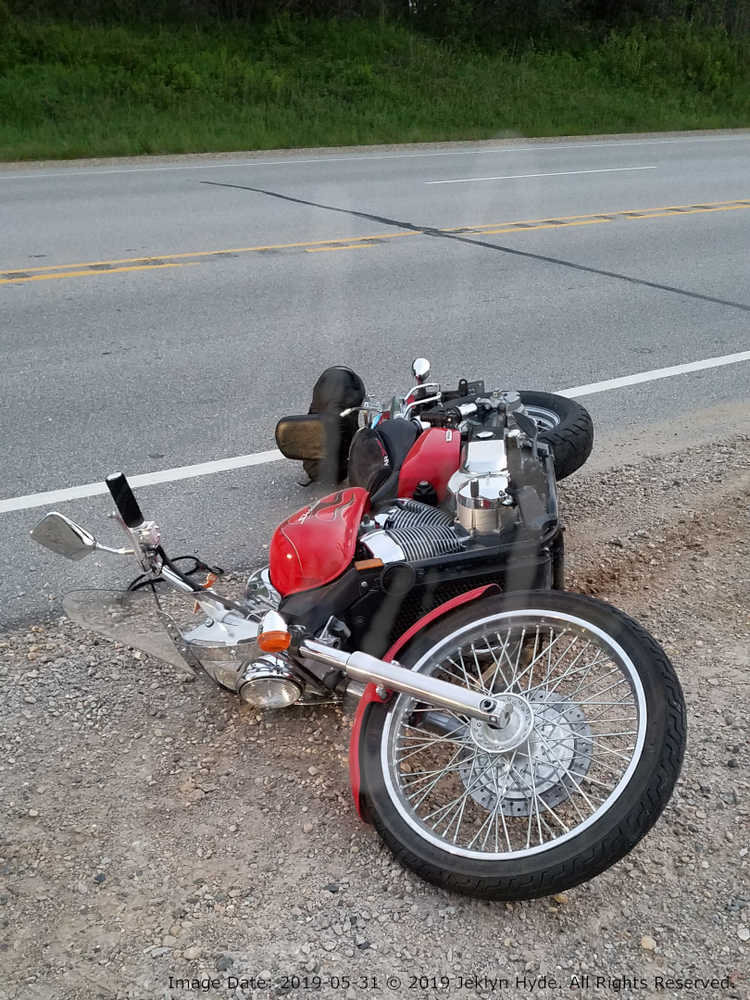 I call in the accident and they ask if they should send an ambulance. I tell them that my injuries aren’t immediately life-threatening, but I don't know the extent of them, so yes, please send a wee-woo wagon. The wait isn't long for the sheriff to show up. They take our statements, and pick up the bike and move it further onto the shoulder out of the road.