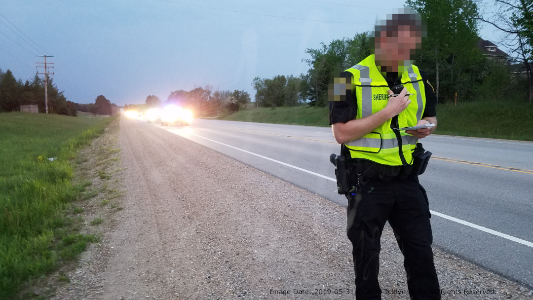 A police officer in a neon yellow vest stands on the gravel shoulder holding their corded remote speaker mic while looking at a notepad. Stopped further up the shoulder, the bright lights of traffic headlights and police vehicles.