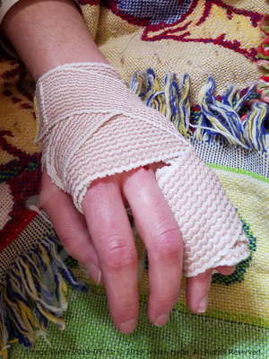 Jeklyn’s left hand the day of the accident with the pinky and ring fingers wrapped together in a stretchy cloth wrap which extends back to the wrist. There is a small wound on the knuckle of her middle finger.