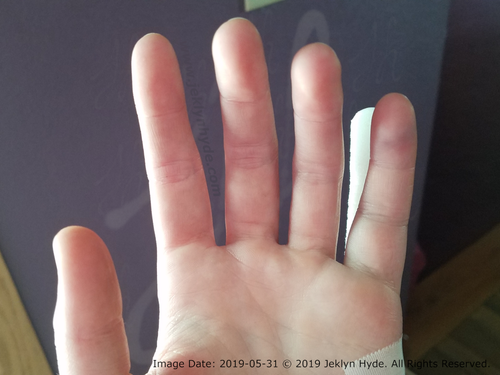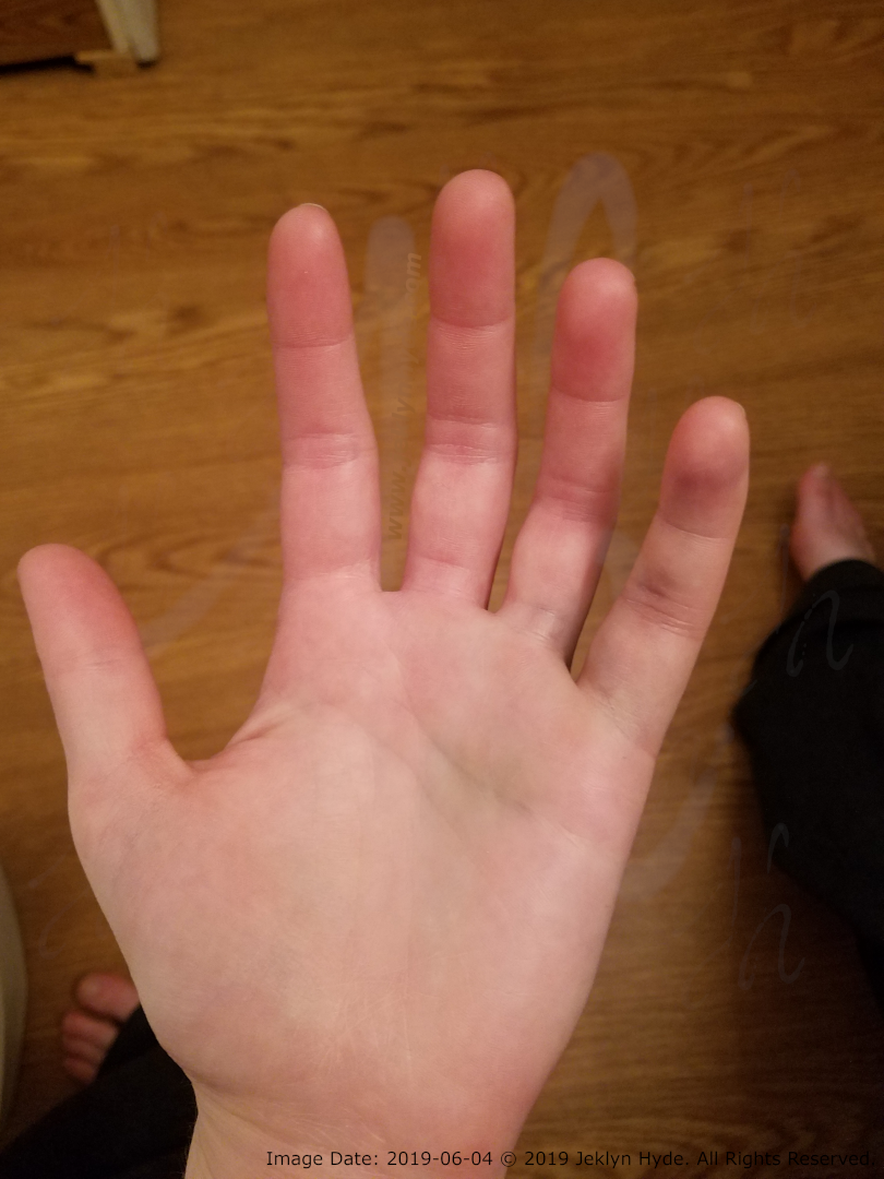 Jeklyn’s left hand four days after the accident. The cloth wrap and pinky brace are removed. The pinky is still showing a lot of swelling and there are black bruises in a few spots near the joints of the finger.