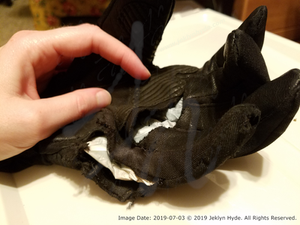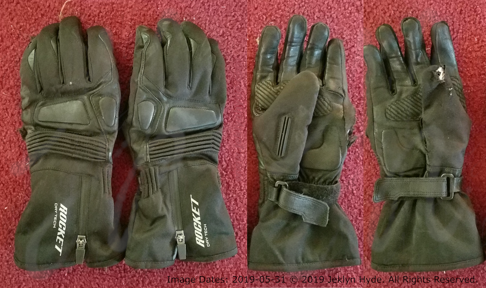 The right glove is torn along the right thumb with a separate hole at the end.