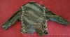 Close-up of the left arm of the leather jacket at the front shoulder showing the stitching that has been ripped apart here.