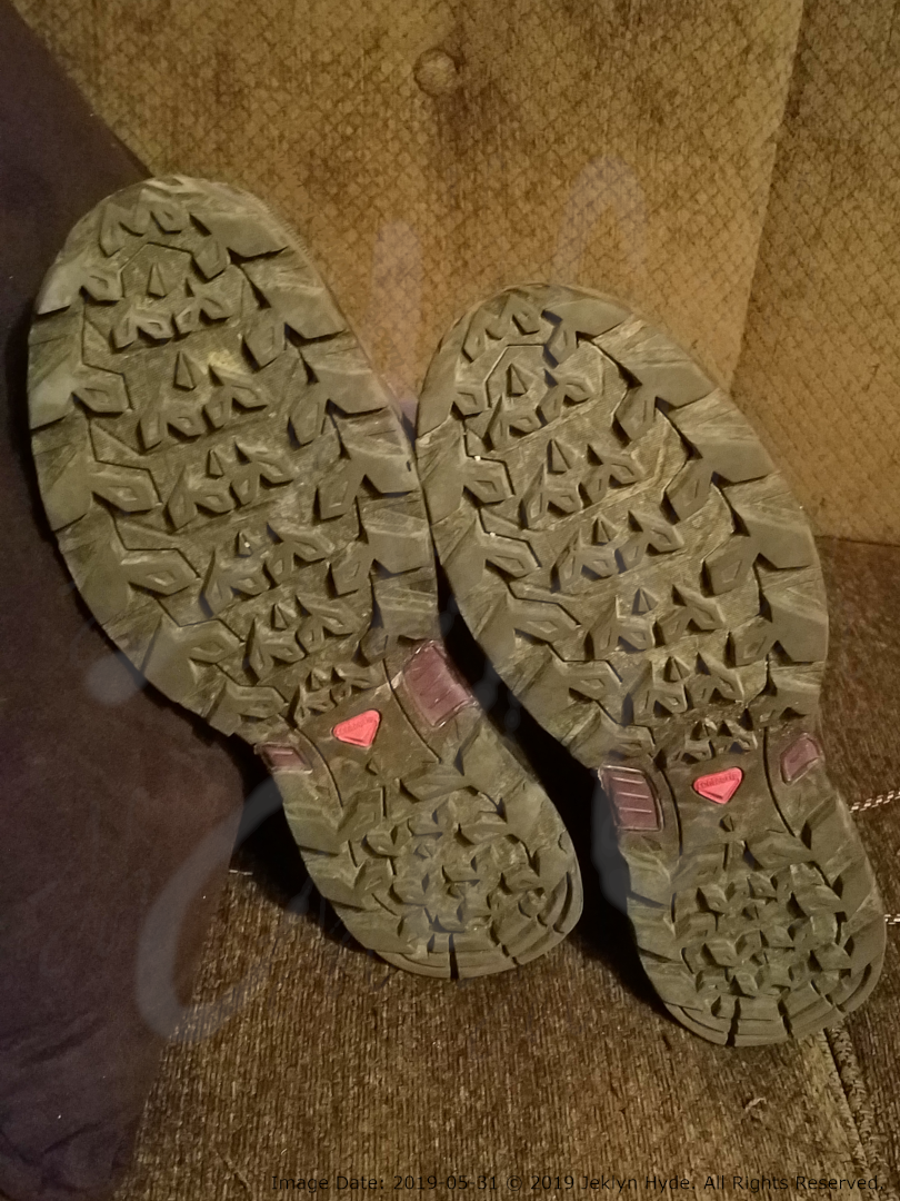 The bottom of a pair of hiking boots showing really good, deep treads. There appears to be no visible damage to the boots apart from the slightest of scuffs to the tip of the right boot.