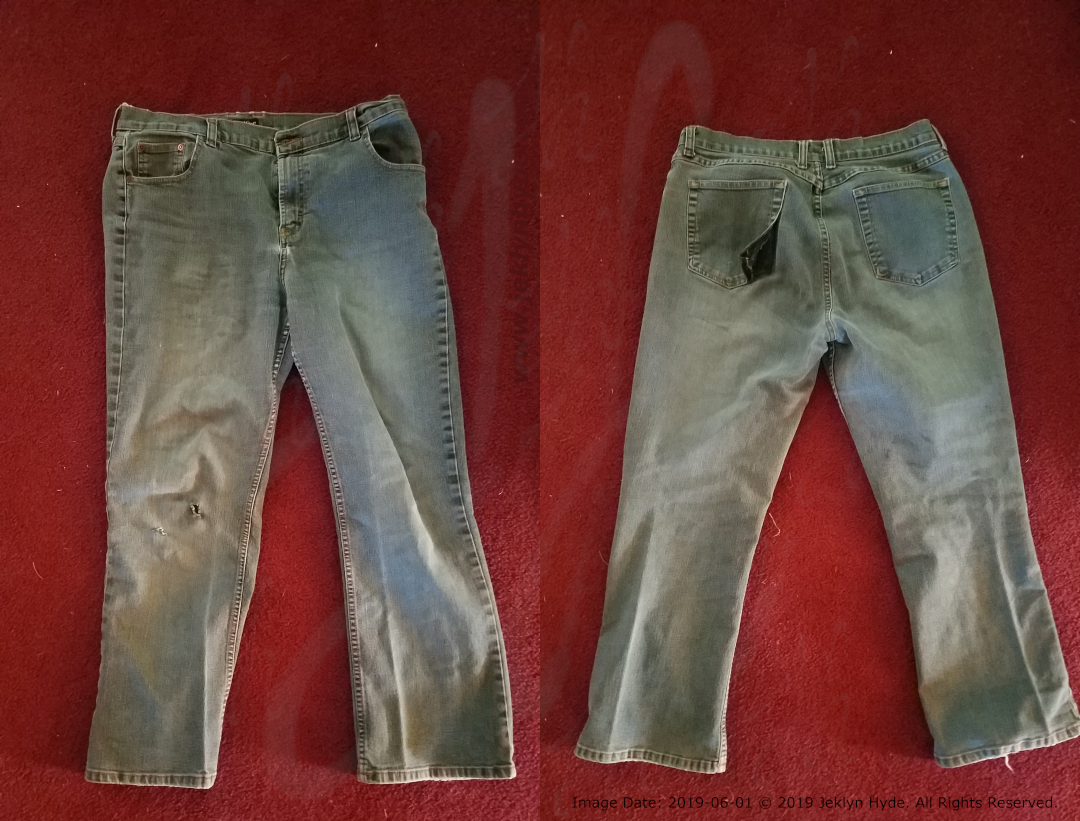 Two pictures that have been combined into one. The back and front sides of a pair of jeans laid out on a burgundy-coloured carpet. On the front there are two holes in the right-side knee. On the back, the left-side pocket is flipped up showing where the stitching has been ripped.