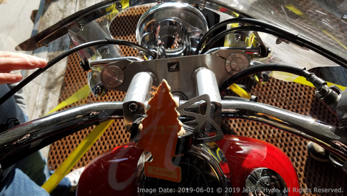 A cruiser-style motorcycle, red with black flame decals, sits in an open garage. Jeklyn is handling the camera, walks over to the motorcycle. There is one of those coconut-scented pine trees hanging from the right handlebar. Her hand reaches out and hits the ignition button. The bike does not start right away, so she rolls the throttle on a bit to give the engine some gas and pushes the ignition again. A couple more tries, and the engine starts up, she revs it a little, then steps back to show the full view of the motorcycle again. The scene cuts directly to another short clip of the motorcycle in the same position after it has had a few minutes to warm up.