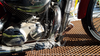 Close- up of the damage to the foot peg and rear brake pedal, which are both bent. The foot peg has been pivoted up to show the underside where the rubber has been scraped away and broken. Part of the air filter cover is visible showing part of the hole that has been scraped through.