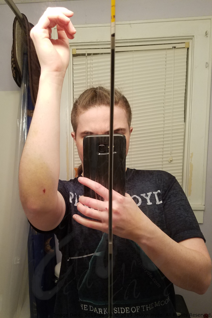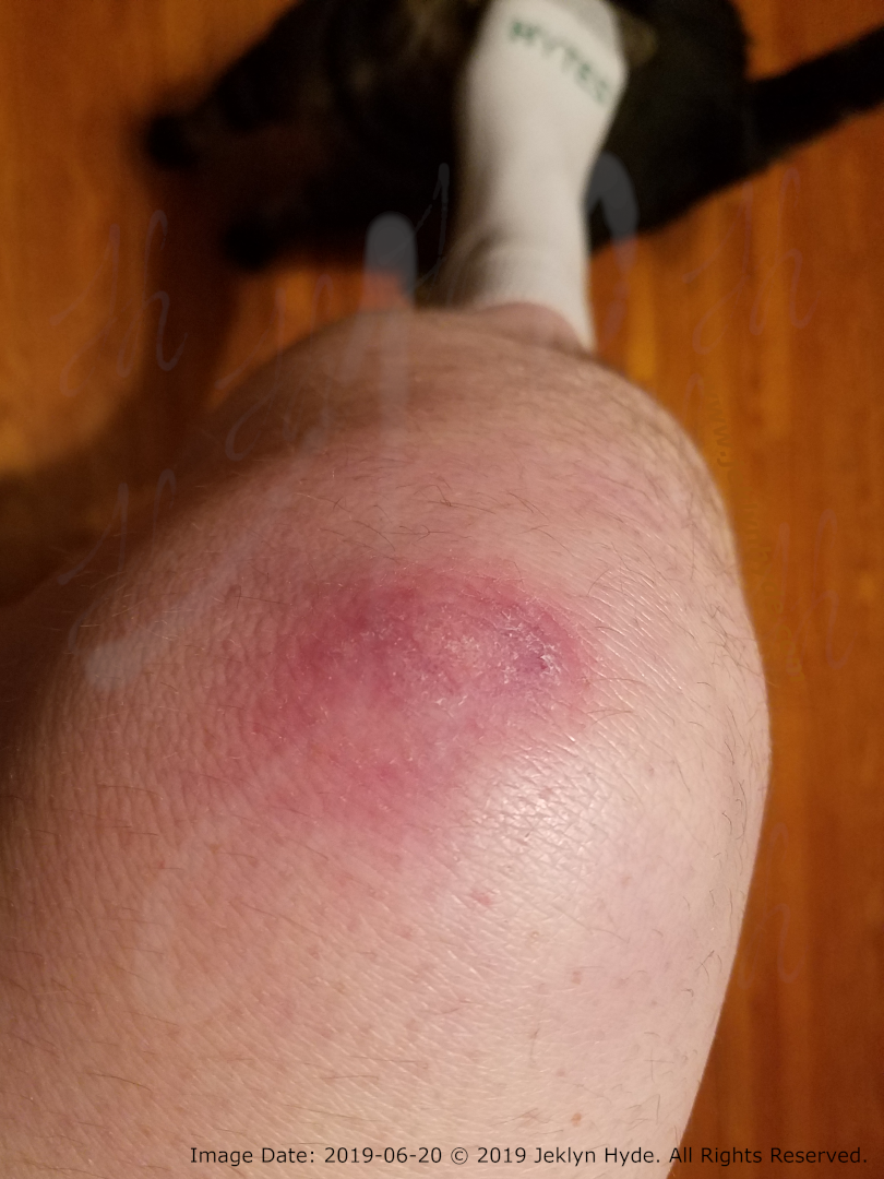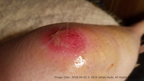Content Warning: Broken skin and surface blood, swelling, bruising, wound-healing with weeping fluid, scabbed over skin.