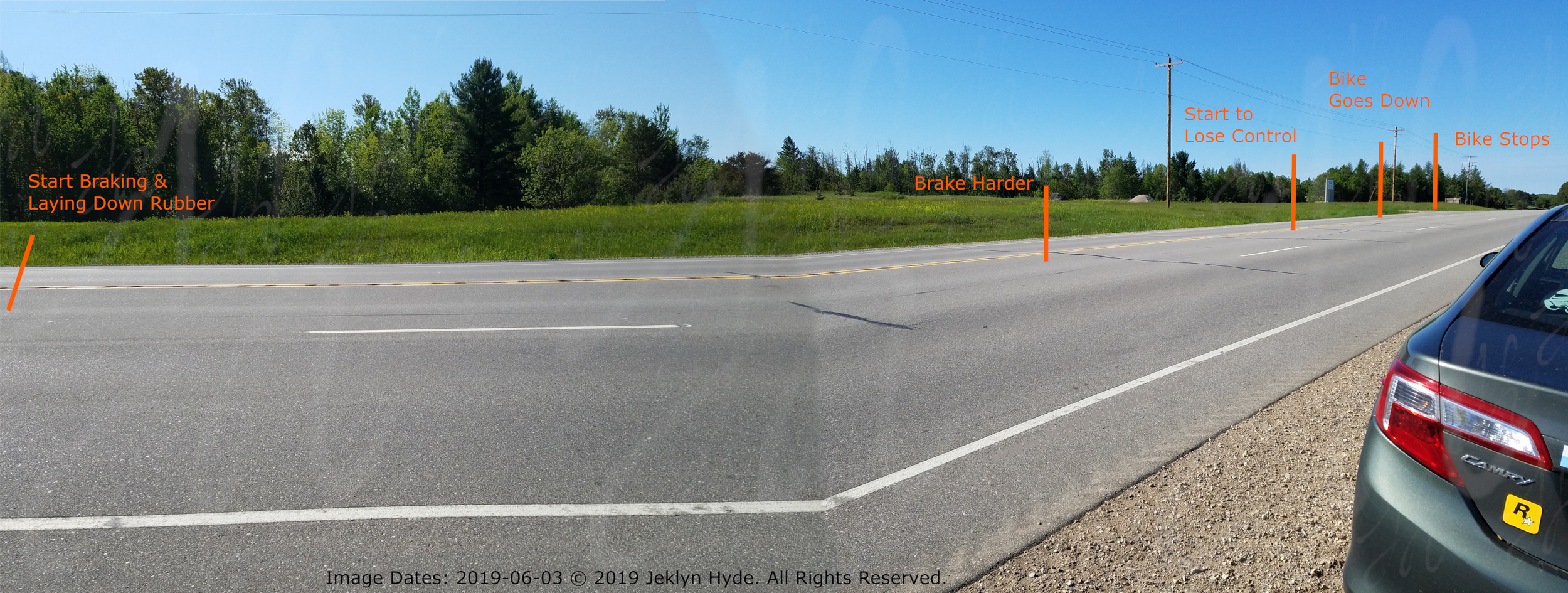 A highway in a passing lane area showing the tire marks that were left on the road where the accident occurred. Image has been composited together from two pictures that were taken while standing on the gravel shoulder behind a parked Toyota Camry with a yellow “R” Rockstar sticker. The tire marks are roughly in the right tire tread of the left-side (center) passing lane. Five orange lines and text have been digitally added marking different points in the tire tracks that were left on the road - All locations are approximate - Distance from the first orange line to the last where the bike stopped is roughly 330 feet - From Left to Right: