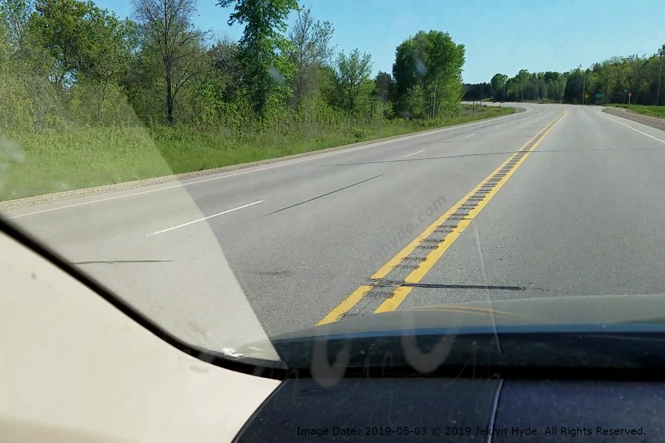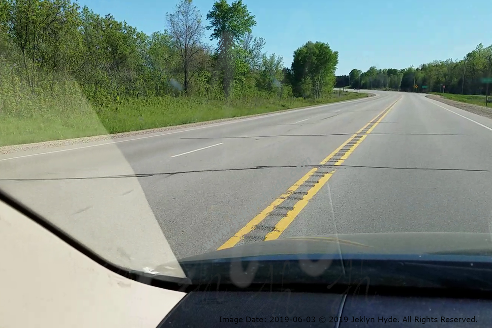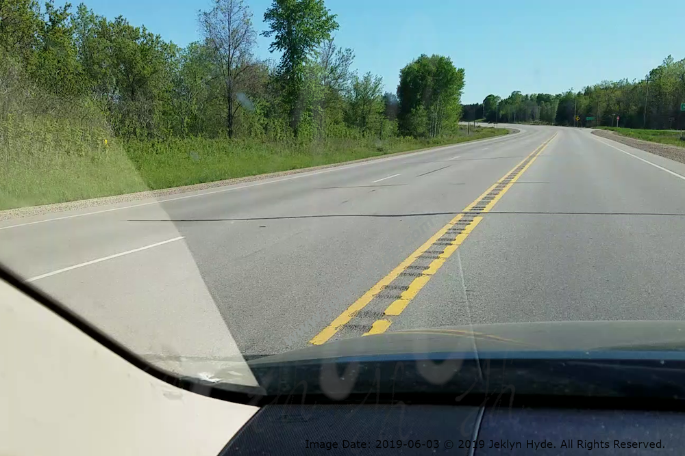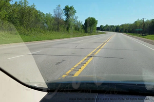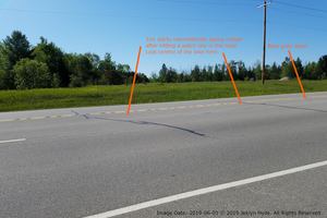 Another view of the road corresponding to the “Start to Lose Control” line in the previous picture. Three orange lines and text have been digitally added marking different points in the tire tracks that were left on the road - All locations are approximate: