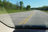 A series of six stills from a video taken from within a moving vehicle. The vehicle interior is reflecting on the inside of the windshield, partially obscuring the view. A highway in a passing lane area surrounded by lush and green trees, tall grass, and other foliage. Pictures are shown in reverse order starting with the point where the first tire mark was laid down.