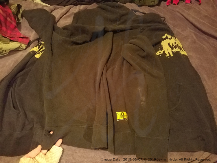 A black World of Warcraft zip-up hoodie with a Blizzard logo on the bottom-right side on the back, spread out on a purple blanket showing the back with the left arm pushed up out of the way. Jeklyn’s wrapped left hand is holding the hem at the bottom left of the back and her finger is visible through a hole. There is a light-coloured scuff mark along the back of the right forearm, and some rough fabric along the lower hem on the right side just before the center zipper.