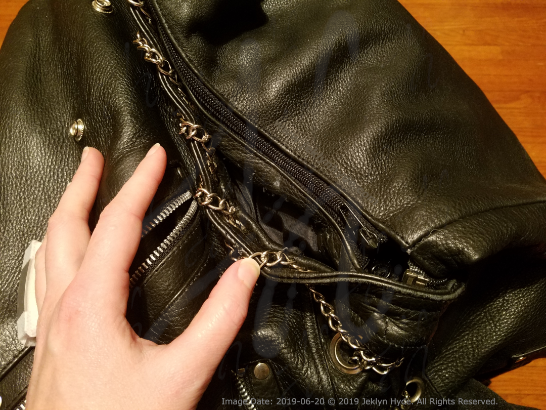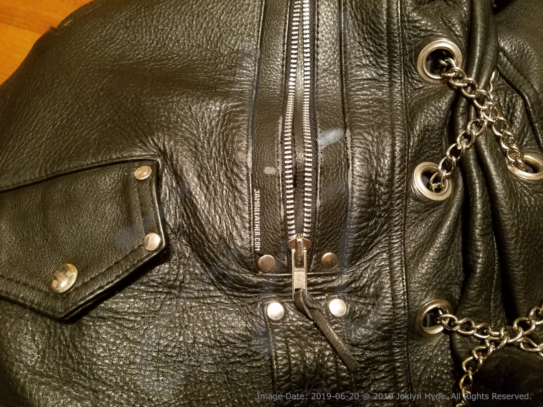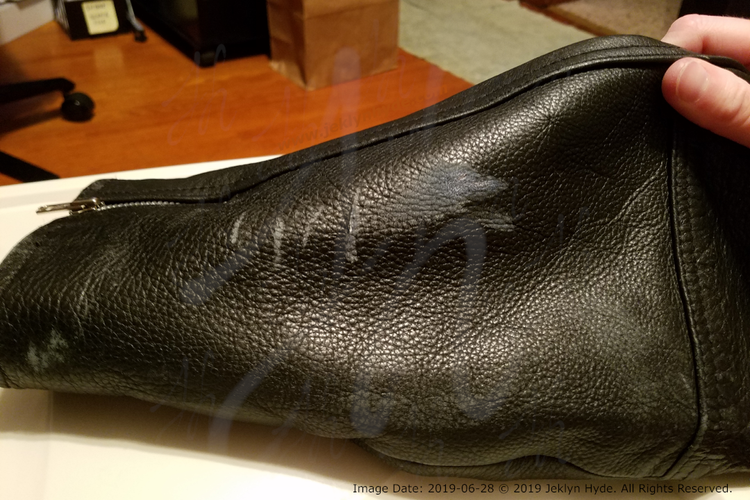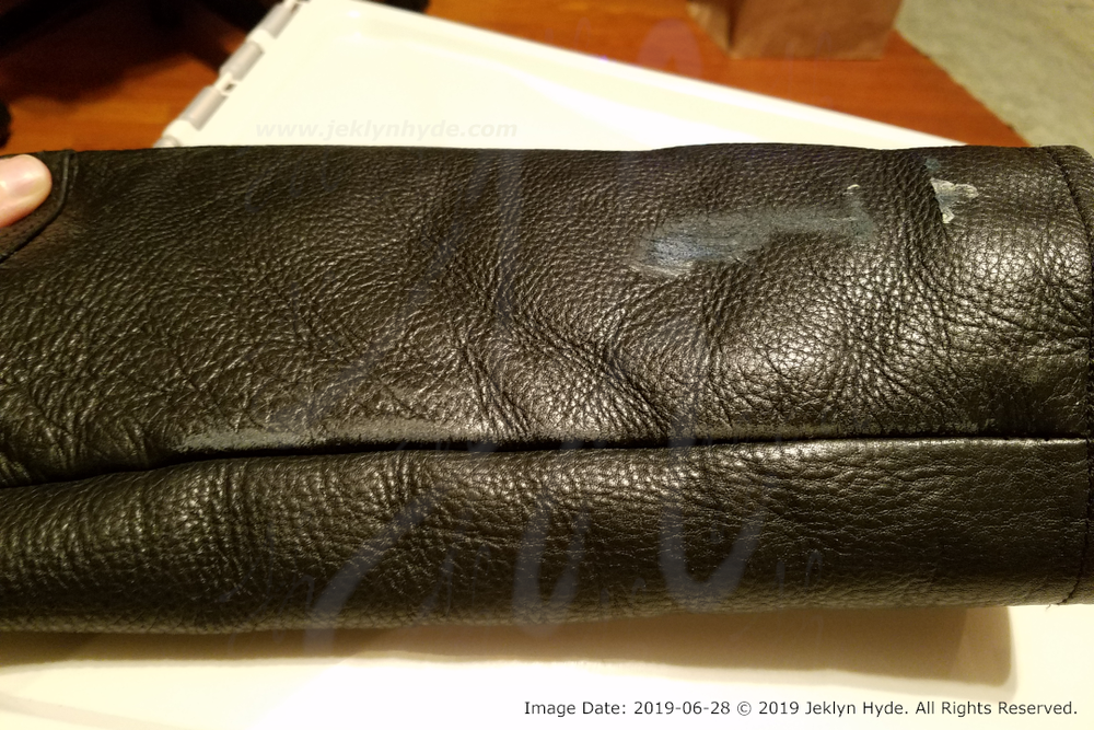 Close- up of the front of the leather jacket showing a small scuff on the left-front zippered pocket. This was just about the only damage that happened to the front of the jacket.