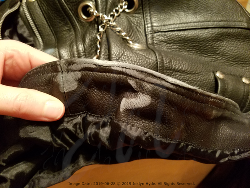 Close- up of the back of the leather jacket with the bottom hem flipped up to show where the leather on the inside is stitched to the lining. There are scuff marks on the inside along the face and the bottom edge of the leather.