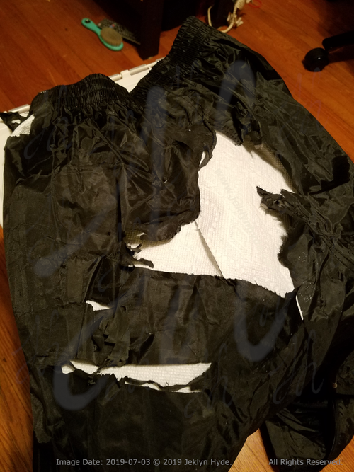 Close- up of the tears in the backside of the rain suit pants with white paper towels inside to make the size and shape of the holes more obvious. There is a hole at the left hip just below the waistband, and several low on the left buttcheek of the pants. Another in the middle of the butt spans from a few inches below the waistband down nearly as low as the crotch.