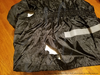 Two pictures that have been combined into one and adjusted for brightness and contrast match. The back and front sides of a black and neon yellow rain suit jacket laid out on a burgundy-coloured carpet. On the front there are rips through the material at the elbows, and above the left-side pocket, and on the back on the left side low near the hem.