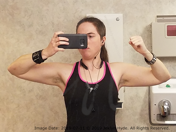 Jeklyn, 41 days after the accident, in a public bathroom this time, taking a selfie in the mirror. The image has been flipped so that it is no longer a mirror image. Her hair is pulled back in a long ponytail, and she’s wearing a black undershirt with neon pink trim.