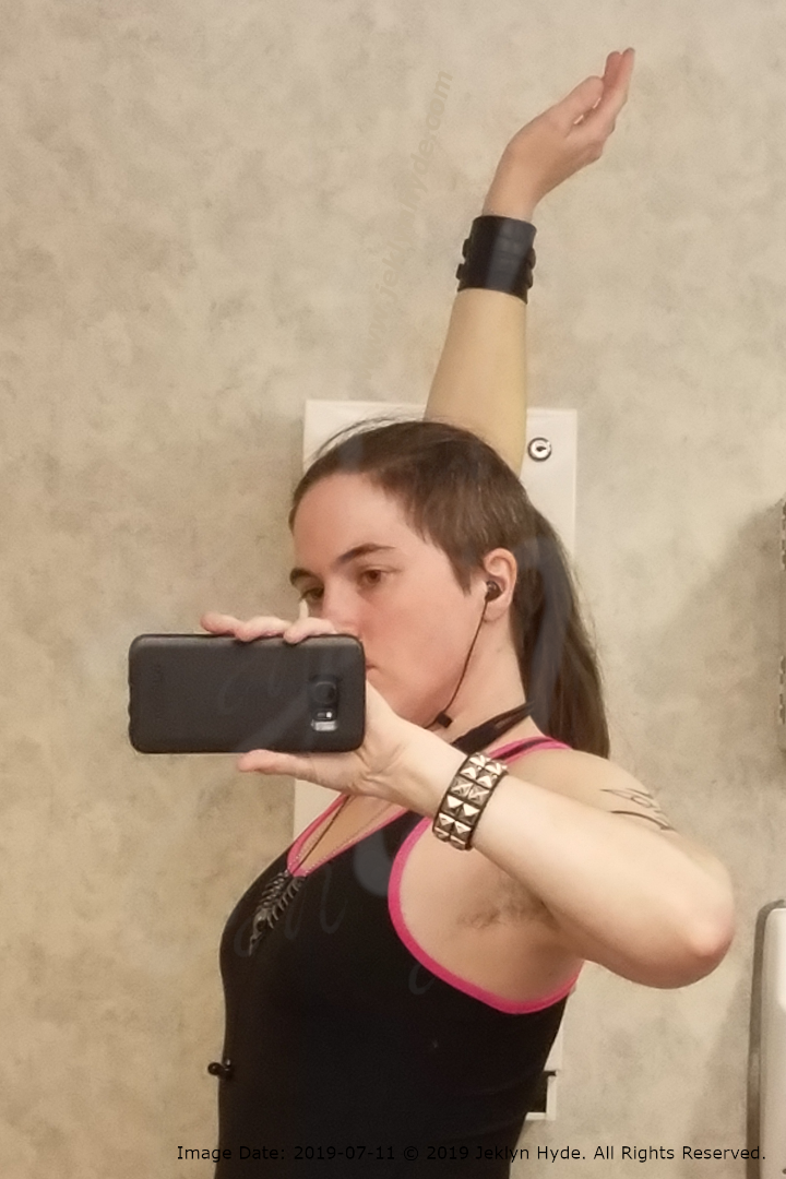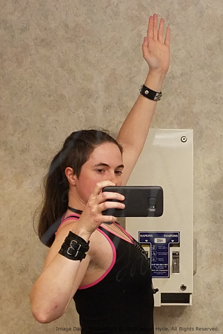 She is standing with her left side to the mirror. Her right arm is raised straight above her head and it still looks a little green in this lighting. This side has normal mobility.